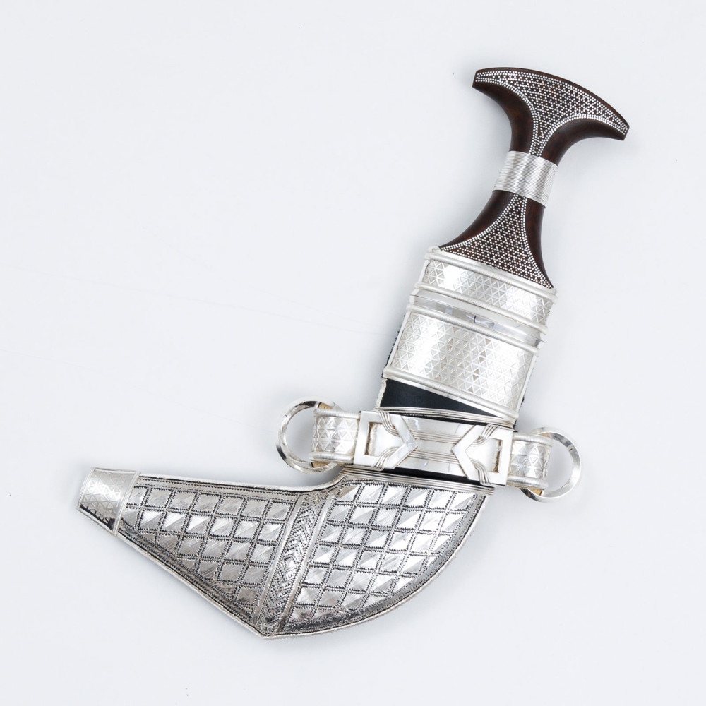خنير إماراتي تقليدي مصنوع من الفضة و/أو الذهب، وجلد الإبل الطبيعي المطرز بخيوط فضية و/أو ذهبية ونصلة (شفرة) مصنوعة من الفولاذ الصلب. تم صنع كل خنير يدويًا بأيدي حرفيين ذوي خبرة، وتم إنشاؤه بدقة باستخدام أنظمة وآليات مصممة حسب المقاس.